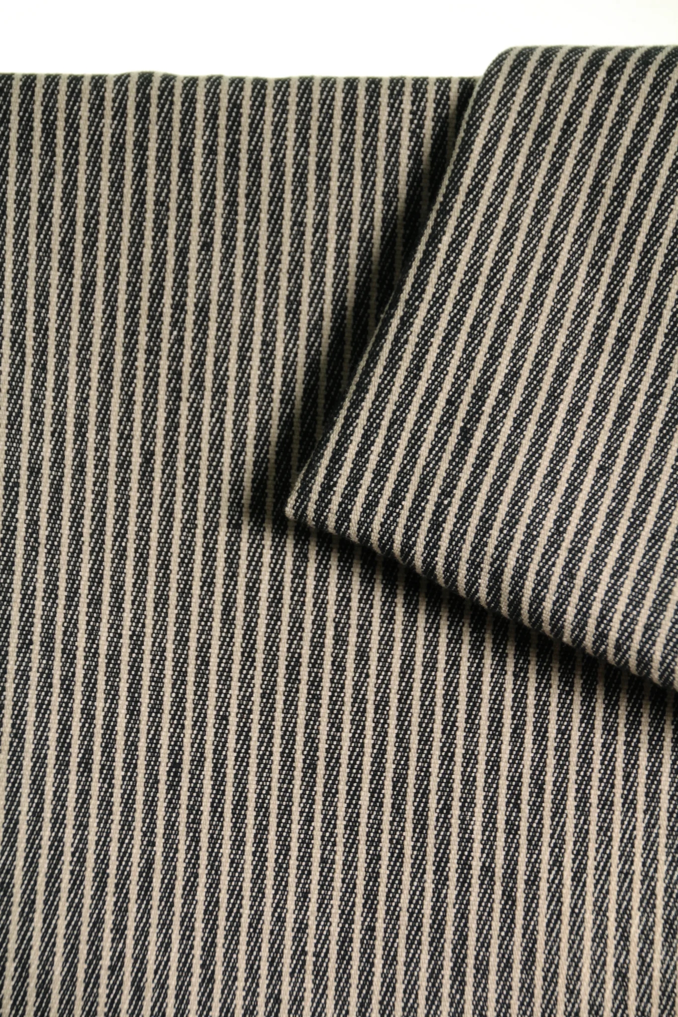 Wunderschöner, griffiger Baumwoll Jeans, fein gestreift in navy/beige. Die Streifen laufen quer zur Laufrichtung des Stoffes, doch kann dieser in beide Richtungen vernäht werden! Diese Qualität eignet sich bestens für Hosen, Blazer uvm. Vor dem Vernähen waschen, da der Stoff ca. 2% einläuft.
