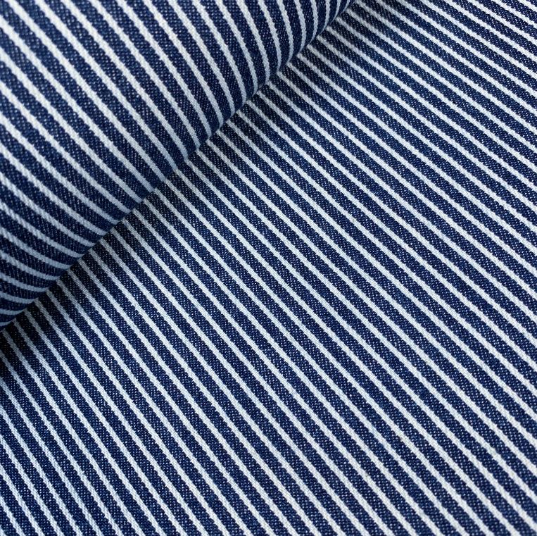 Fester Baumwollstoff in Jeansdesign mit einem klassischen Streifen Muster. Ideal geeignet zum Vernähen für Hosen, Kleider und vieles mehr.