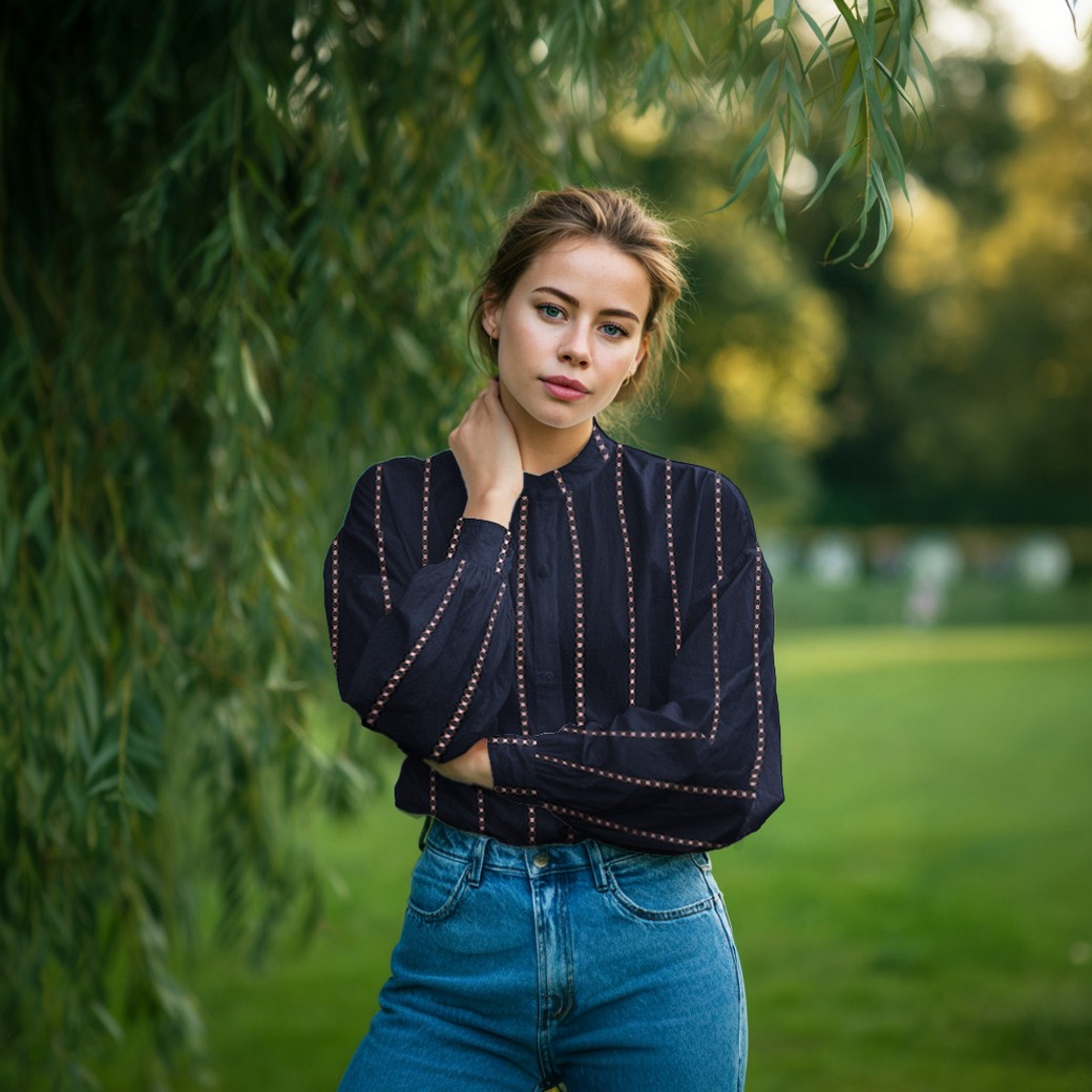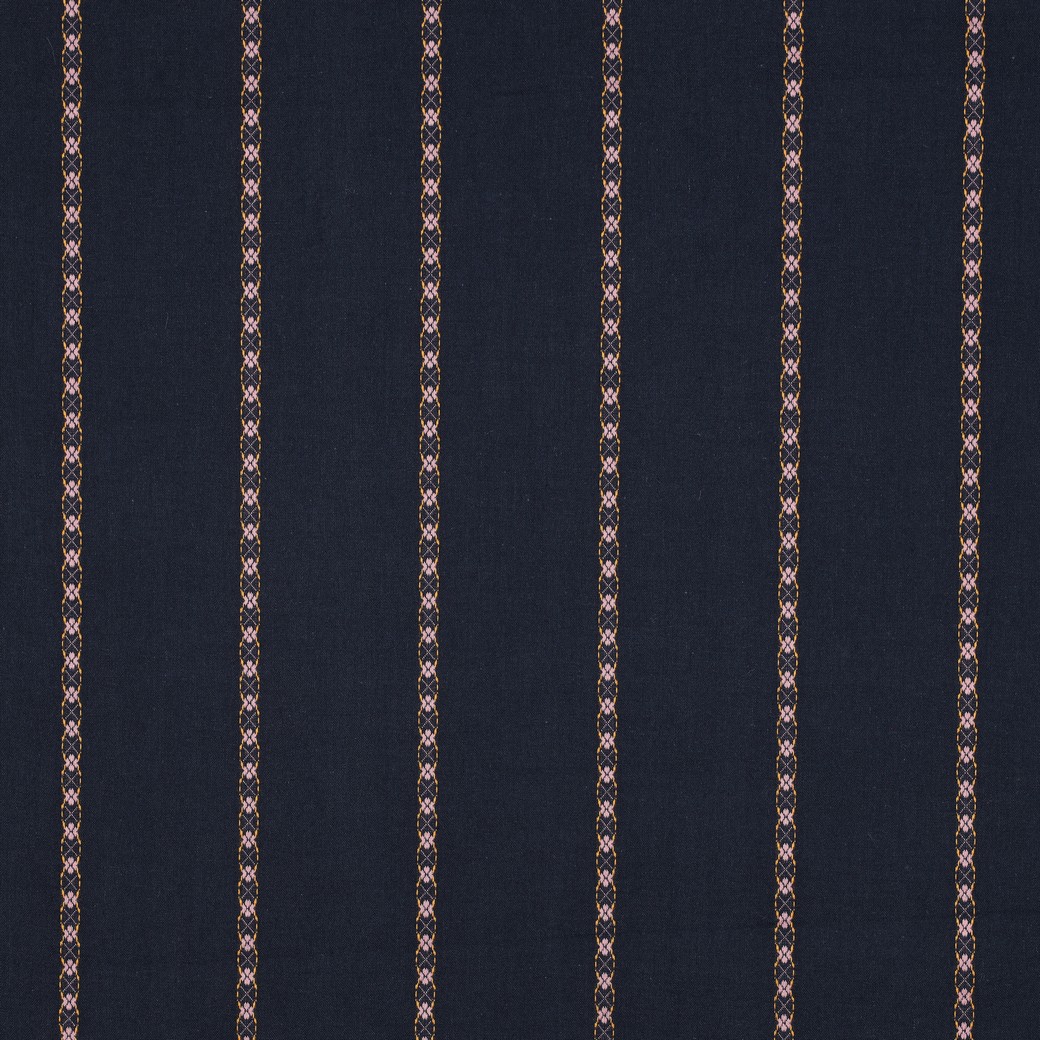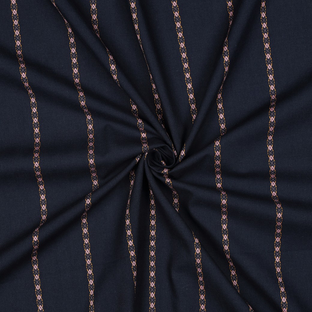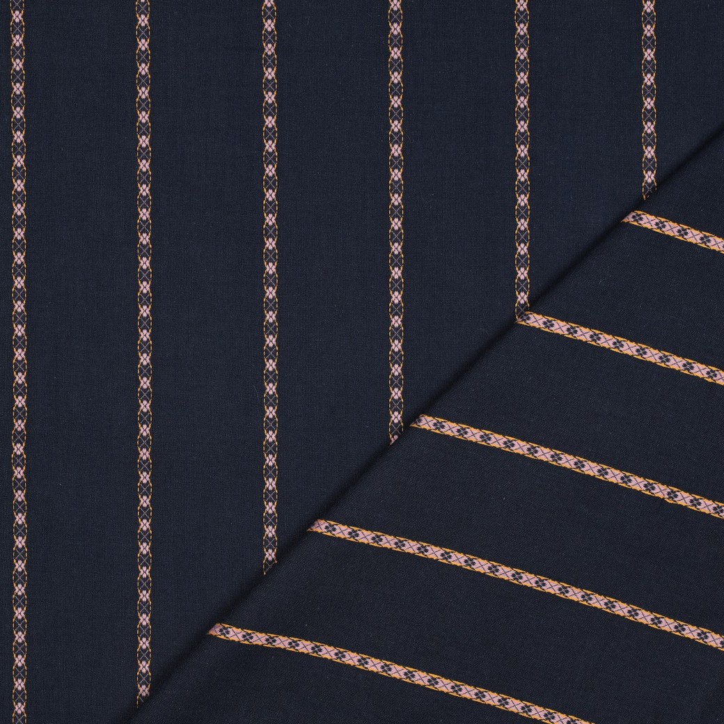 Diese hochwertige Baumwolle überzeugt mit ihrer glatten, angenehmen Qualität und einem natürlichen Tragegefühl. Der Stoff ist atmungsaktiv, hautfreundlich und eignet sich ideal für vielseitige Nähprojekte. Das klassische Streifendesign wird durch feine, dekorative Details aufgelockert und verleiht dem Stoff eine elegante, zeitlose Optik.