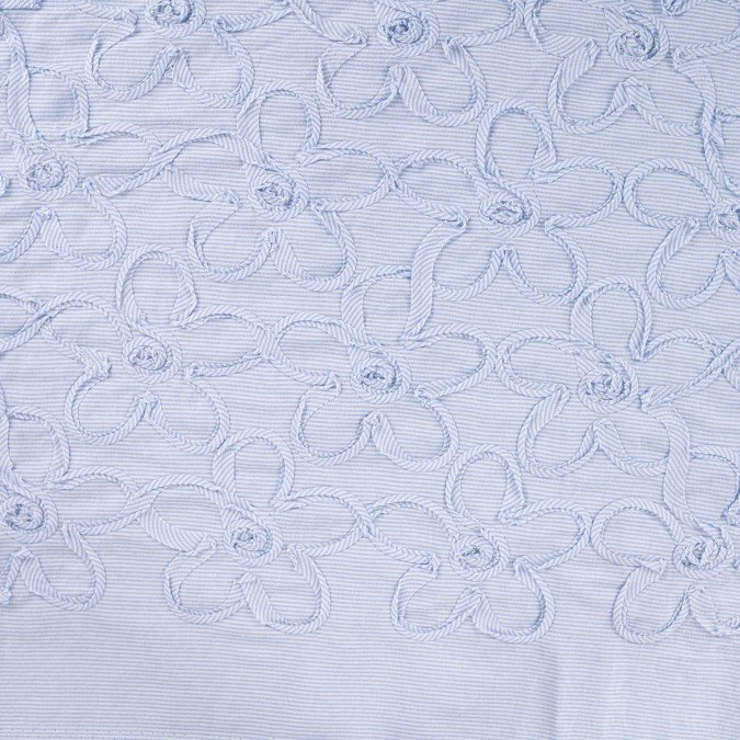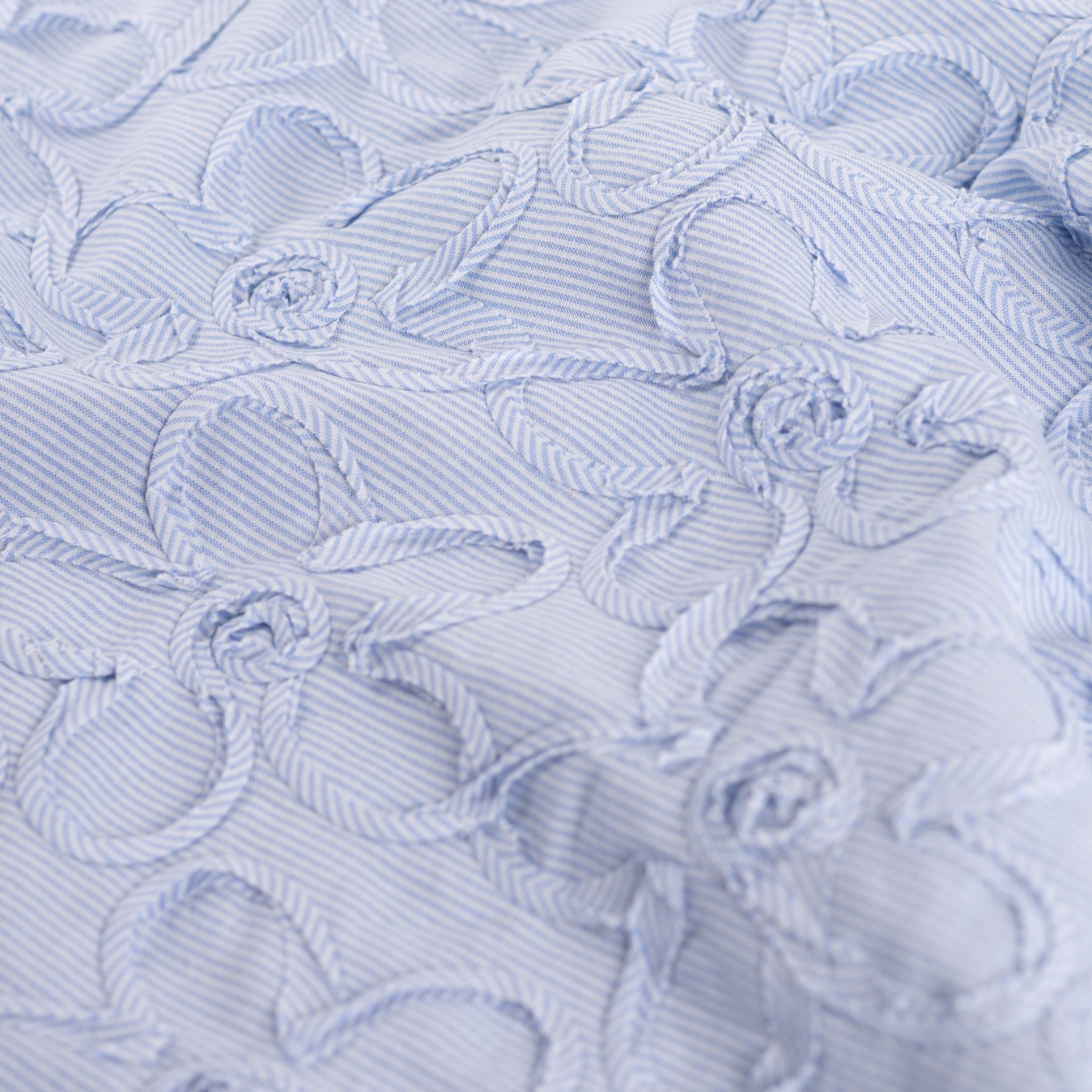 Eleganter Baumwollstoff mit feiner Streifenstruktur und dekorativem Blütenrelief. Die zarten, plastisch gearbeiteten Blumen verleihen dem Stoff eine edle Optik und eine besondere Haptik, während die dezenten Streifen für eine zeitlose Basis sorgen.