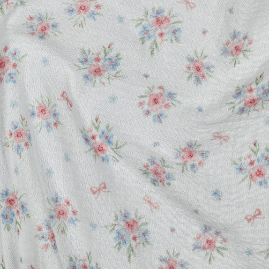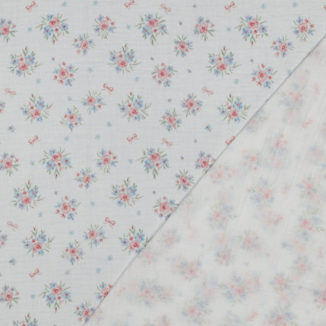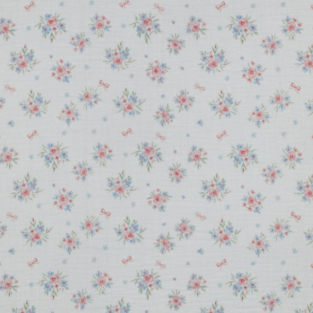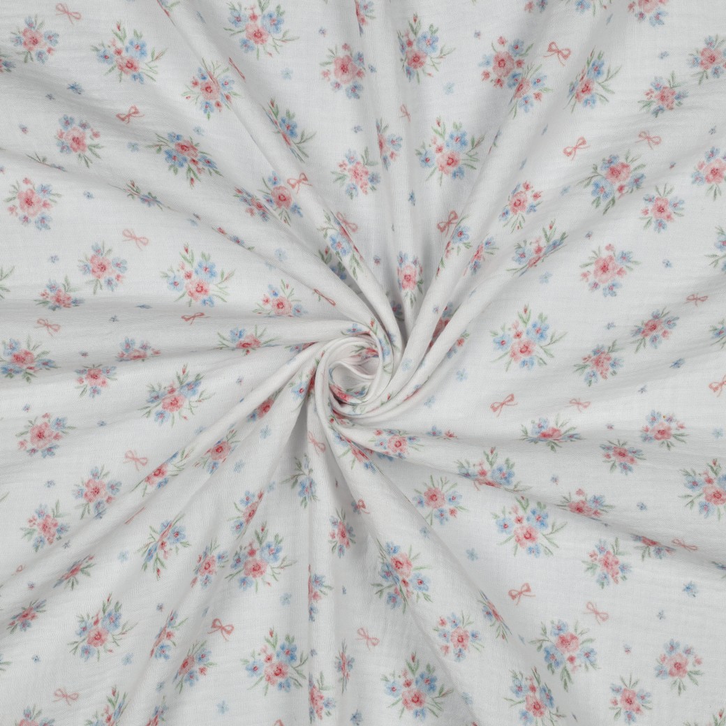 Dieser hochwertige Musselin überzeugt mit seiner weichen, luftigen Qualität und der typischen, leicht gekreppten Struktur. Das zarte Blütenmuster mit feinen Schleifen verleiht dem Stoff eine romantische, verspielte Optik. Angenehm auf der Haut, atmungsaktiv und pflegeleicht, ist der Stoff ideal für leichte, bequeme Kleidung mit liebevollen Details.