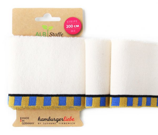 Mit den Cuff Me´s eröffnen sich unzählige neue Designmöglichkeiten und grenzenlose Kreativität. Die Qualität, der feste Anfang, die ideal farblich abgestimmten Jacquard Jerseys eröffnen Dir neue Dimensionen der Kreativität. Die Bündchen bieten tolle neue Designmöglichkeiten und verleihen deinen genähten Schätzen einen wunderschönen Look. Die Farben sind passend zu den Albstoffe Kollektionen, können aber auch sehr schön für andere Stoffe verwendet werden.