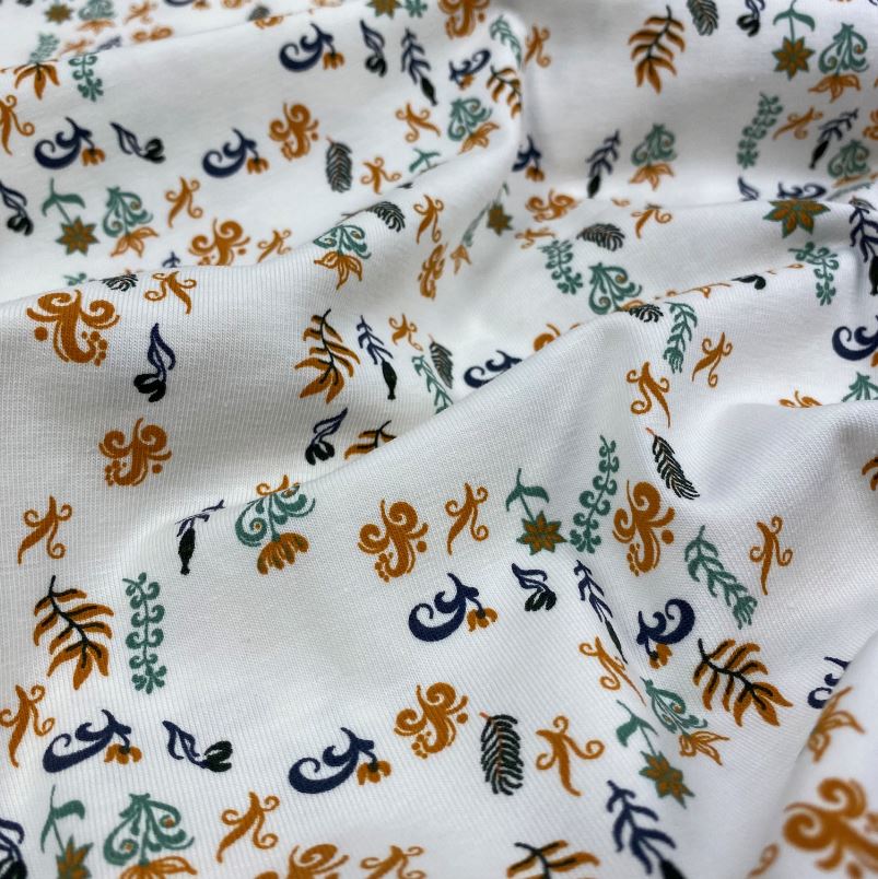 Ein wunderschöner Baumwolljersey bedruckt mit kleinen Ranken und Blättern. Die perfekte Ergänzung zu Jersey Fox ecru. Ideal geeignet zum Vernähen für Top, Shirts, Kleider, Leggings und vieles mehr.