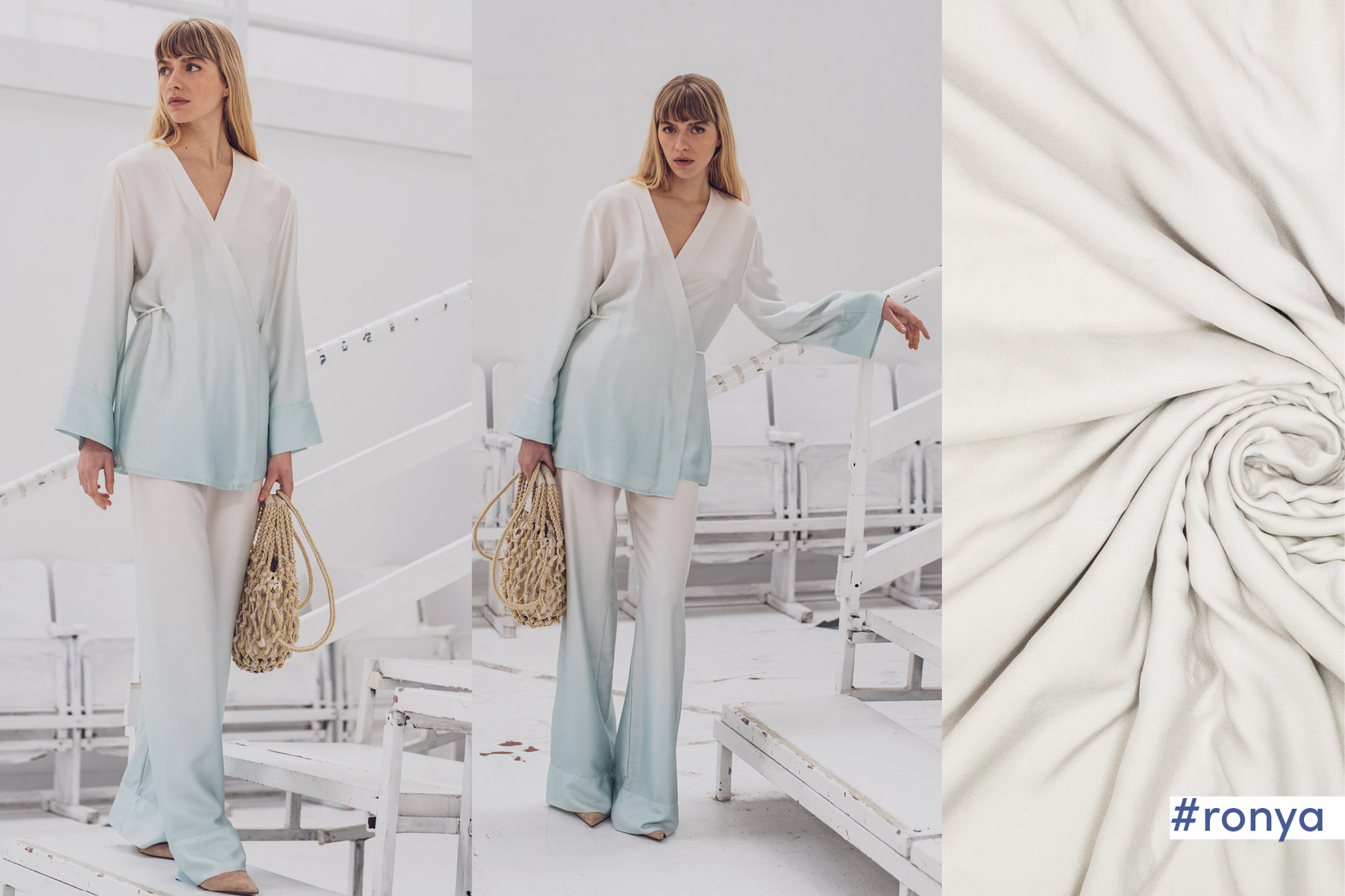 Ein besonderes Highlight ist der sanfte Farbverlauf von einem hellen Cremeton zu zartem Pastelltürkis, der dem Stoff eine moderne und stilvolle Optik verleiht. Perfekt geeignet für Blusen, Kleider, weite Hosen oder fließende Oberteile mit eleganter Ausstrahlung.