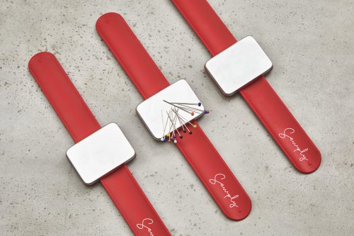 Sehr schönes und edles Handgelenk Nadelkissen von Sewply. Das Schnapp-Armband passt sich perfekt dem Handgelenk an und die magnetische Fläche hält die Nadeln dort, wo du sie brauchst.