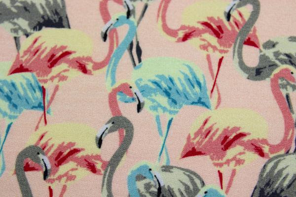 Ein wunderschöner Summersweat Modal mit Flamingos. Ideal für die Sommerkleidung wie Shirts, Kleider, Shorts etc. luftig und leicht zu tragen.