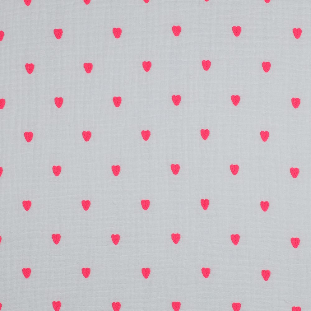 Dieser hochwertige Musselin begeistert mit seiner weichen, luftigen Struktur und einer liebevollen Herzstickerei, die dem Stoff eine besondere, verspielte Note verleiht. Die feine Crinkle-Optik sorgt für einen natürlichen Look und macht den Stoff angenehm leicht sowie besonders komfortabel auf der Haut.