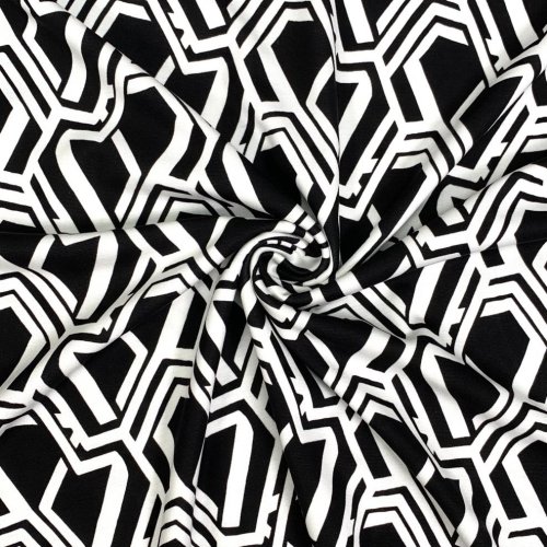 Sehr glatter, fester, feiner und stretchiger Punta Jersey mit abstraktem schwarz-weiß Muster aus Viskosegemisch. Die Materialzusammensetztung sorgt für einen schönen Fall und ein angenehmes Tragegefühl. Ideal geeignet zum Vernähen für Hosen, Kleider, Röcke, Shirts und vieles mehr.
