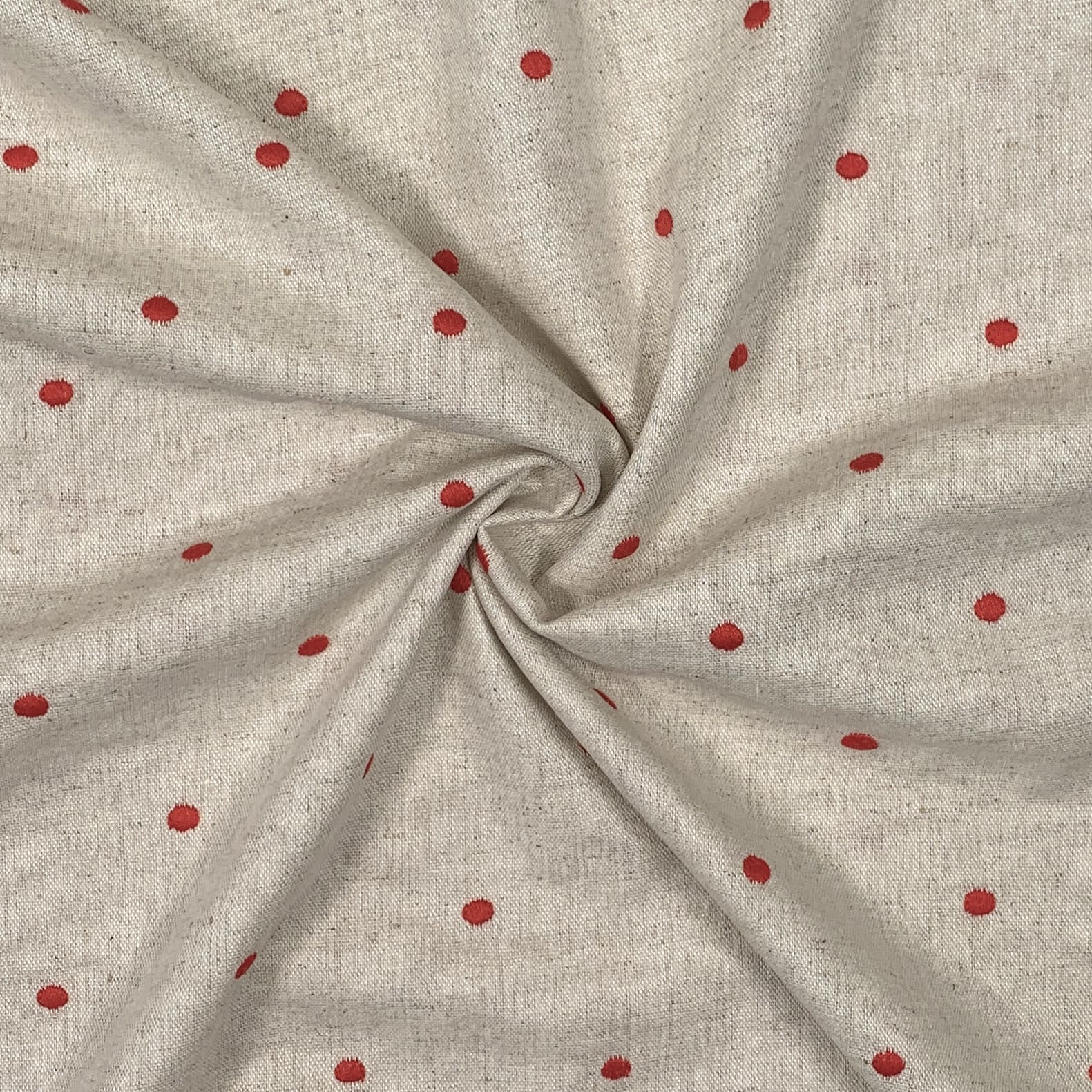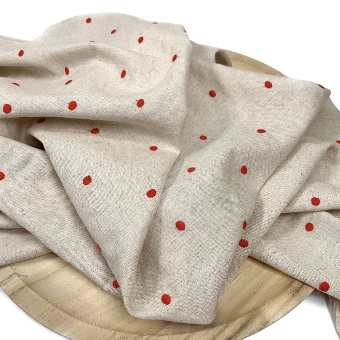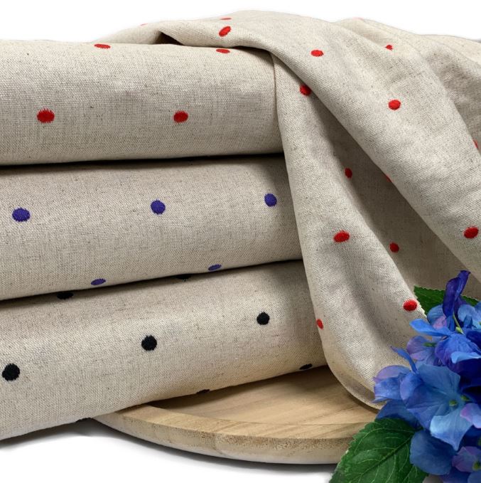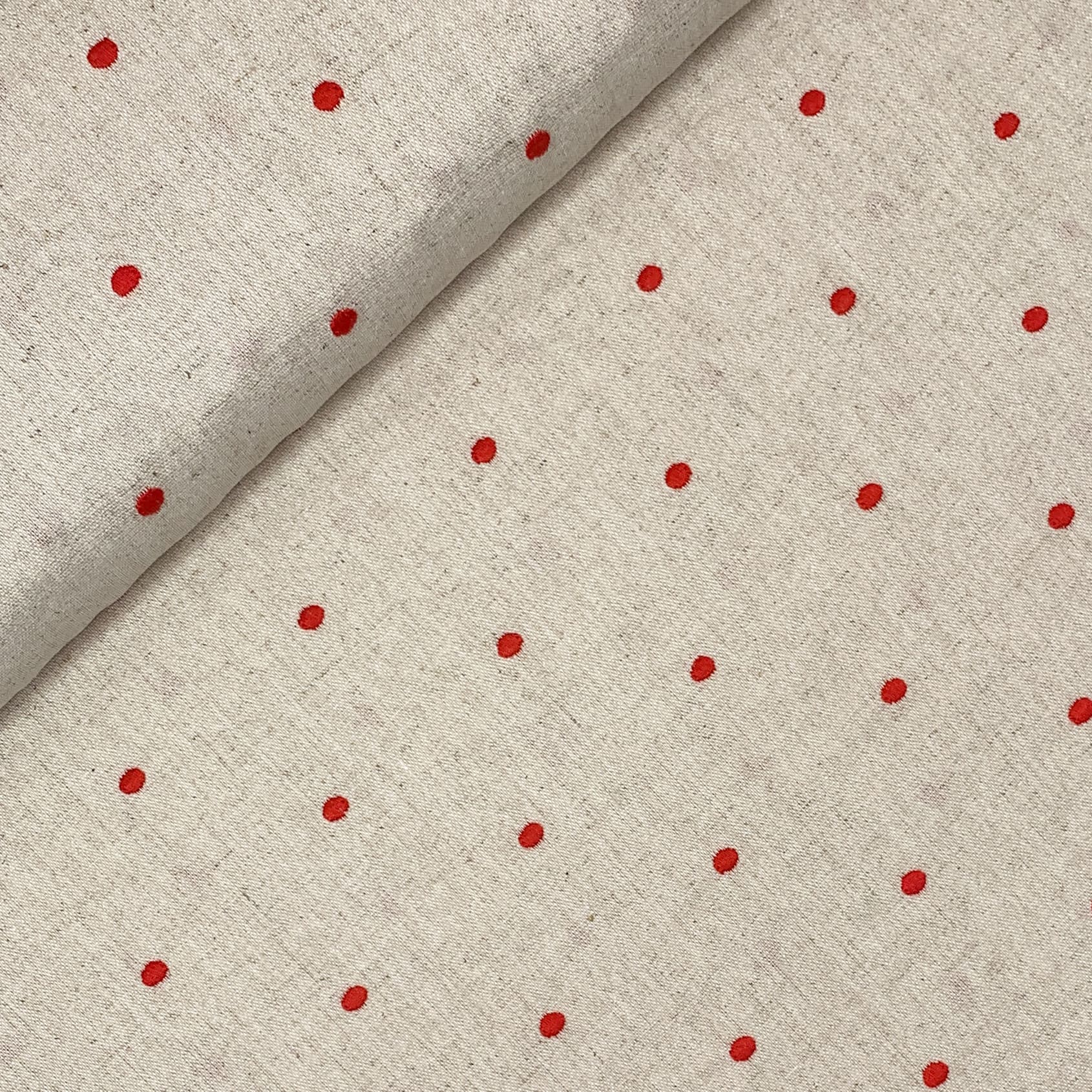 Ein weicher naturfarbenen Leinen-Viskose Stoff. Er ist wunderschön mit gleichmäßig verteilten Punkten bestickt. Ideal für Sommerhosen, Röcke, Kleider, Blusen oder Tücher.