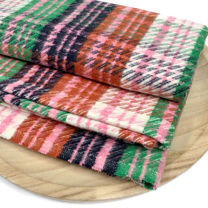 Ein wunderschöner, gewebter Mantelstoff mit flanellartiger Oberfläche. Das Karomuster zeigt sich in aktueller, frühlingshafter Farbkombination. Der leichtere Stoff eignet sich hevorragend zum Nähen von Shackets, Capes, Übergangsmäntel, Blazer oder auch Hosen im Anzug-Style.