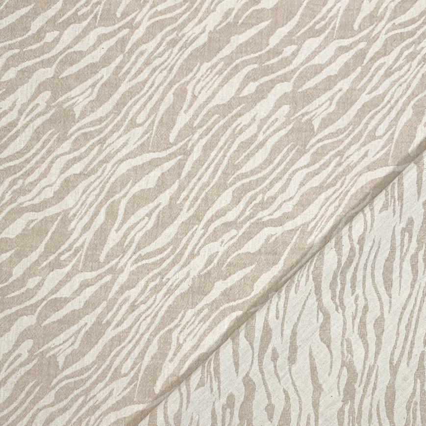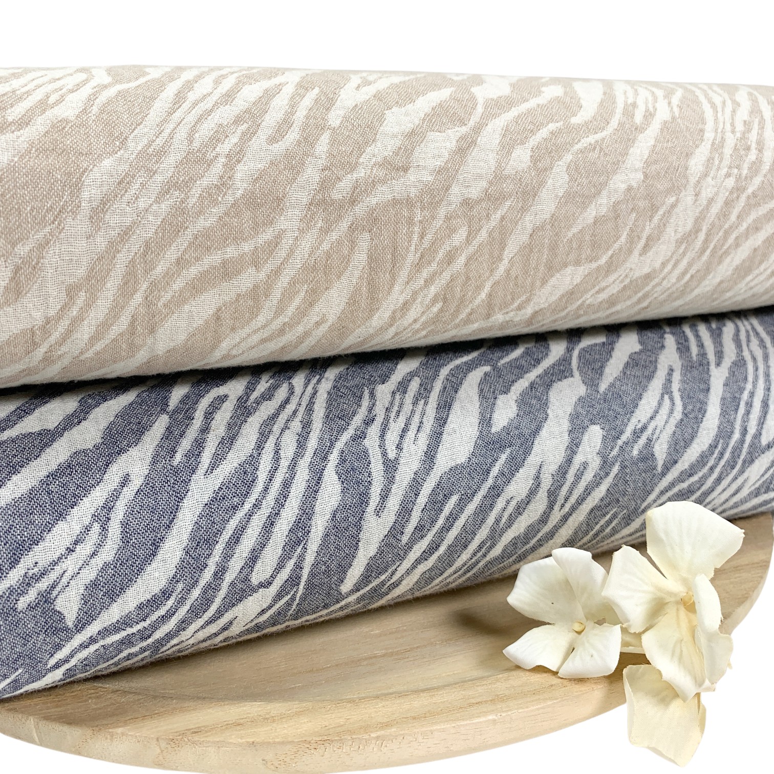 Fantastischer Double Gauze Musselin mit eingewebten Zebramuster. Die Rückseite ist das negativ zur Vorderseite, hier sind Farbe und Muster umgekehrt. Der schöne, leicht griffige Stoff ist ideal für Blusen, Tuniken, Sommerkleider, Tücher etc.