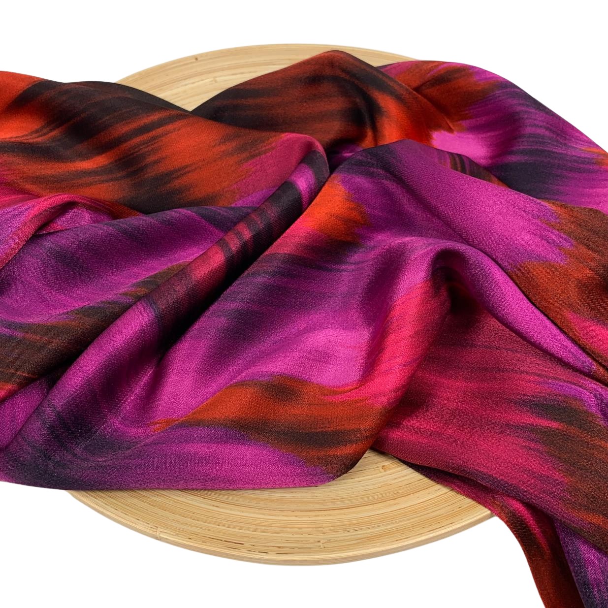 Ein wunderschöner, griffiger Viskosesatin mit glatter, leicht glänzender Oberfläche. Das verwaschen-verzerrte Muster gibt es in drei Farbstellungen. Diese Qualität eignet sich bestens für Blusen, Kleider oder Röcke.