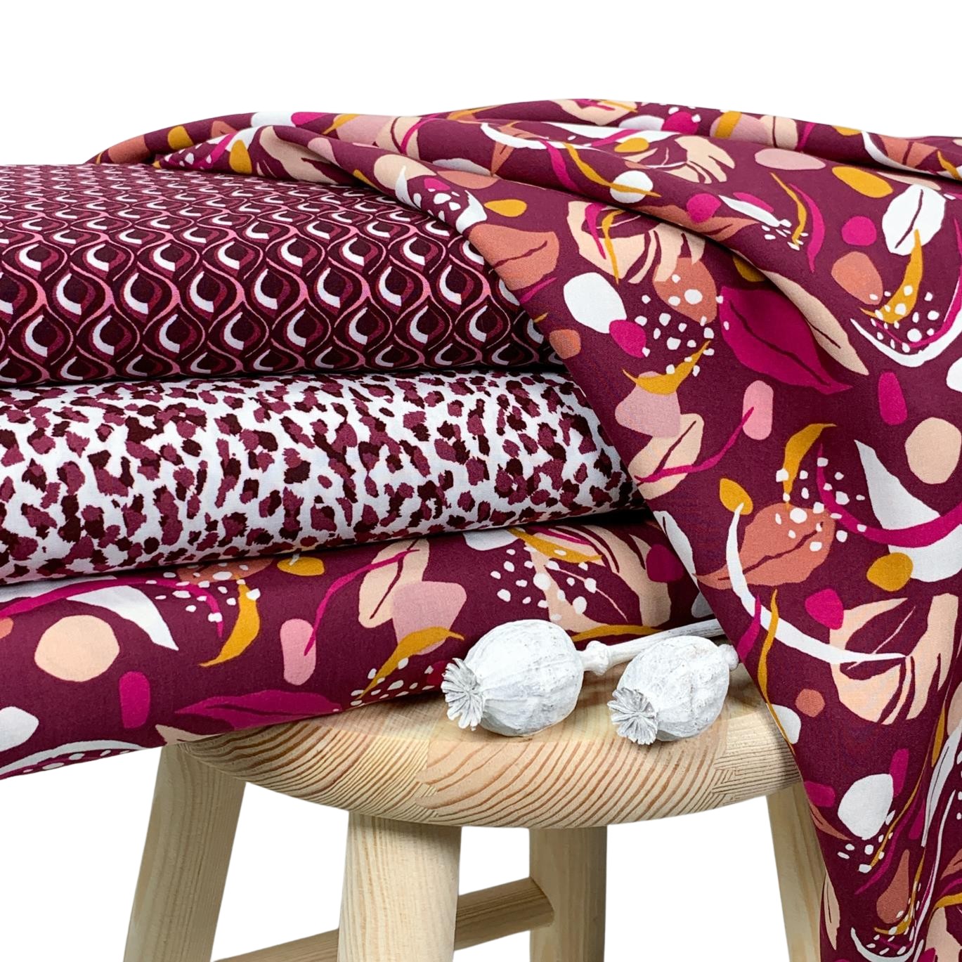 Wunderschöne Viskosewebware mit grafischem Muster. Der glatte und leichte Stoff eignet sich bestens für luftige Tops, Blusen, Kleider, Röcke oder leichte Hosen.