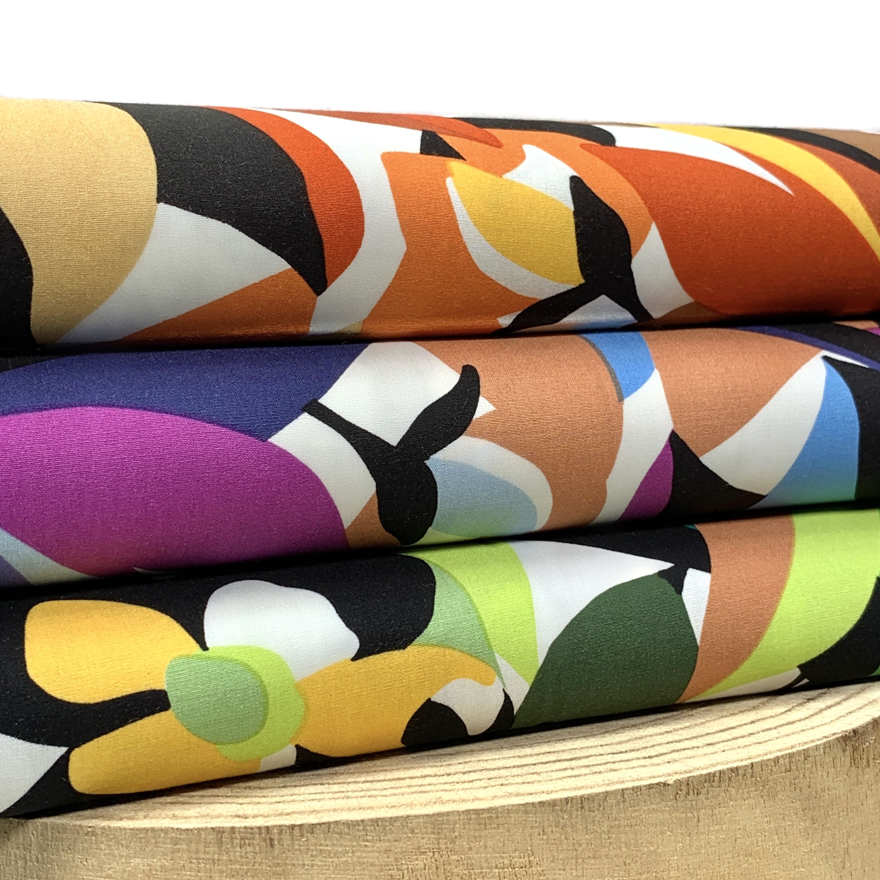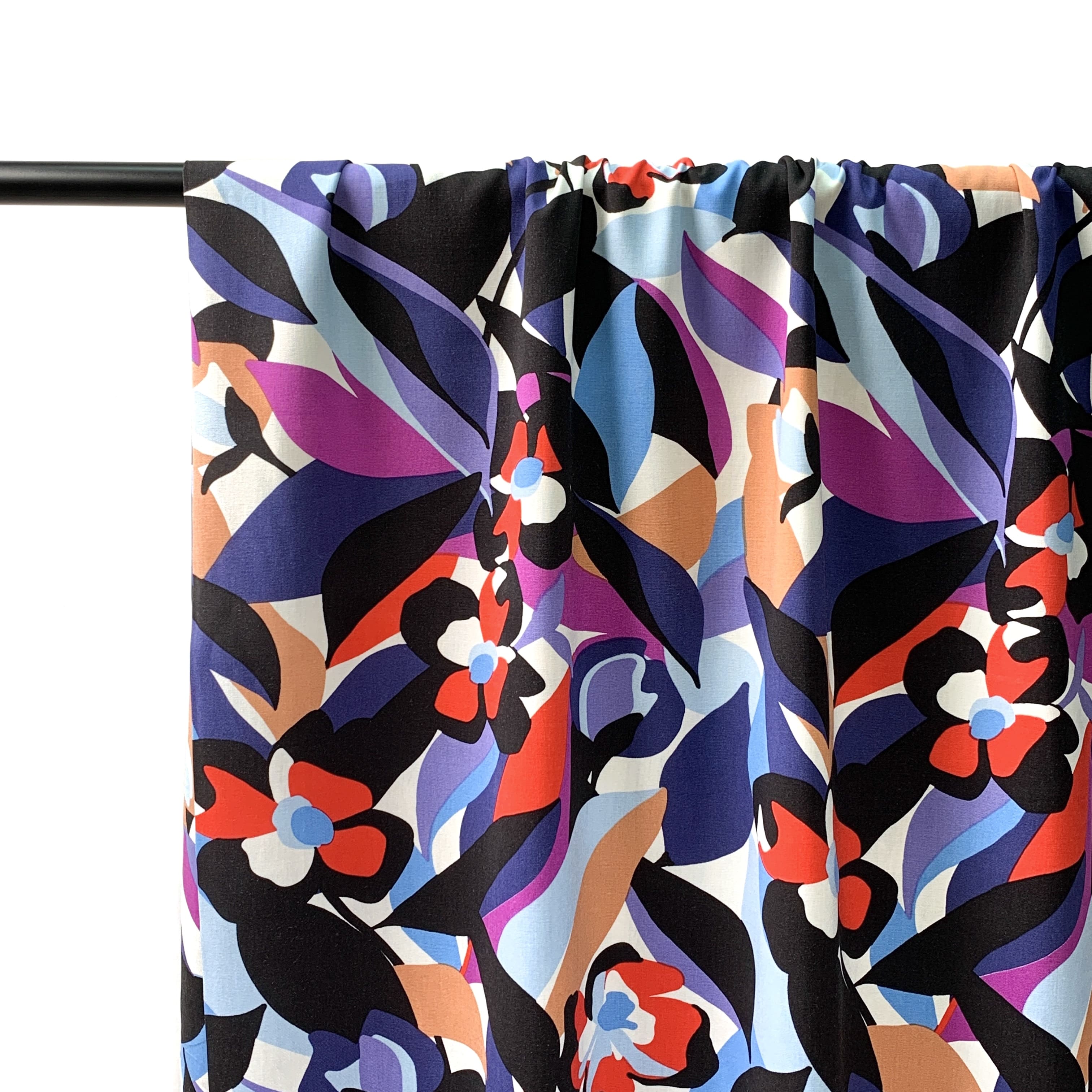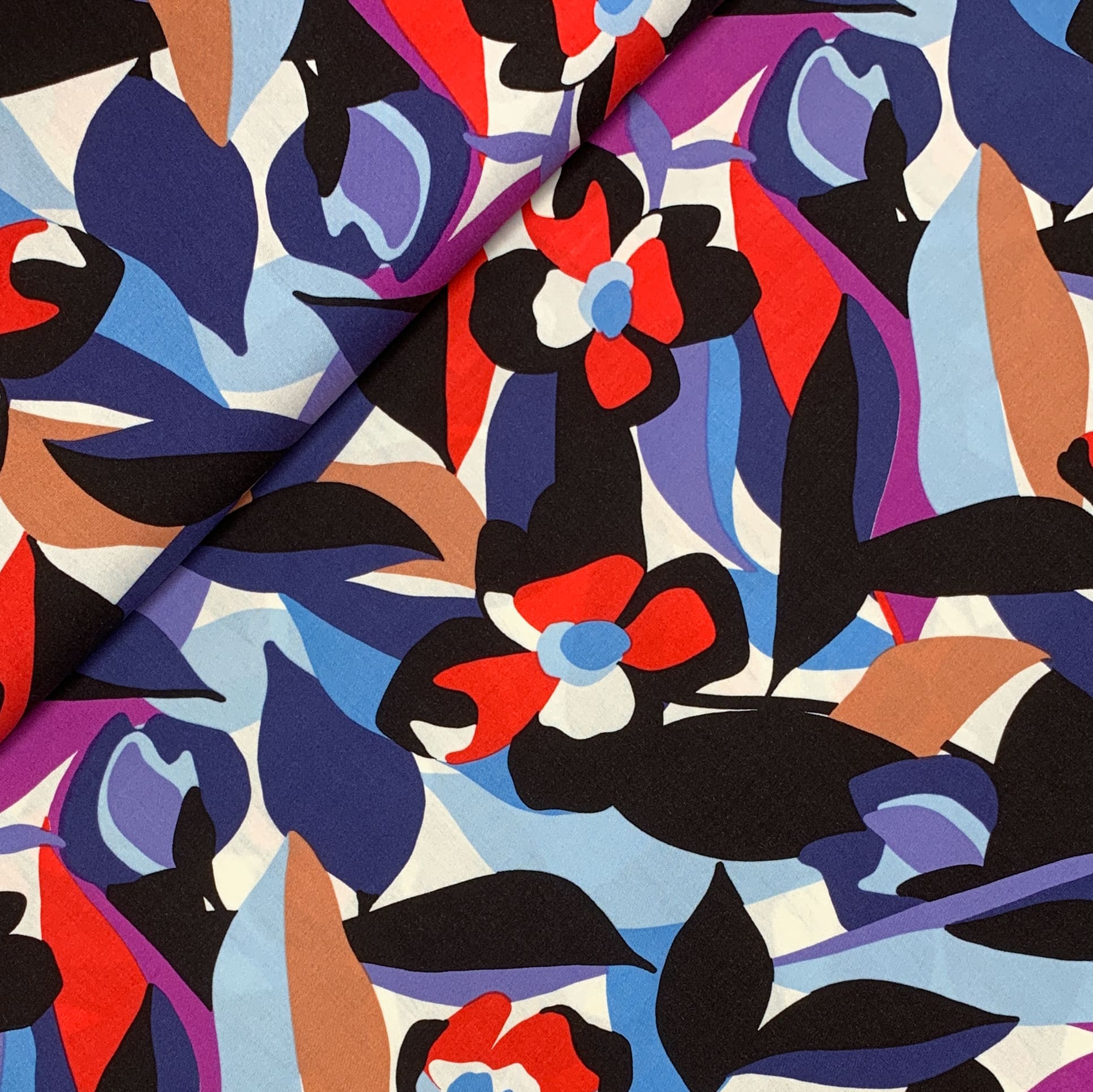 Eine wunderschöne glatte Viskosewebware mit leichtem Elasthananteil. Dadurch ist dieser Stoff schön quer elastisch und bietet hohen Tragekomfort, auch bei körpernah geschnittenen Modellen. Das expressionistische Blätter- /Blumenmuster, welches an Scherenschnitte erinnert, gibt es in drei Farbkombinationen. Dieser Stoff ist ein wahrer Hingucker! Wir empfehlen ihn für Blusen, Kleider oder Röcke.