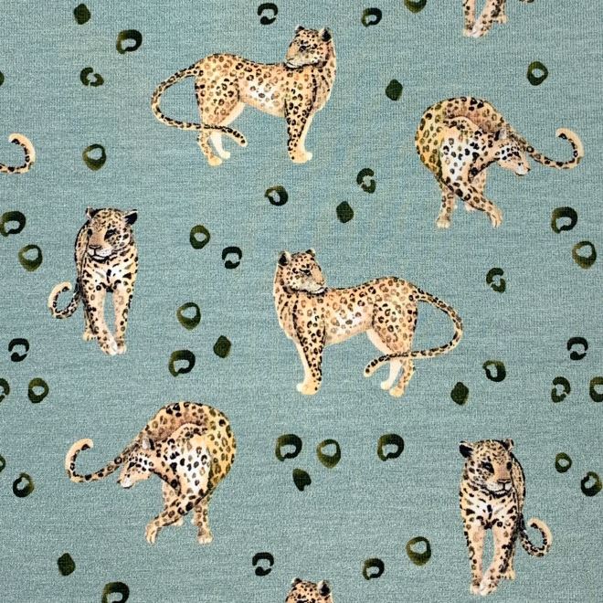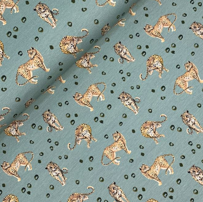 Ein wunderschöner Baumwolljersey bedruckt mit schönem Leoparden Muster. Ideal geeignet zum Vernähen für Tops, Shirts, Kleider, Leggings und vieles mehr.