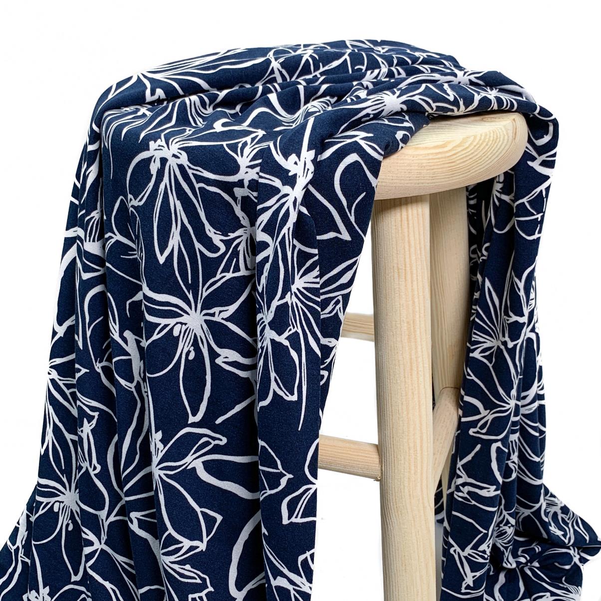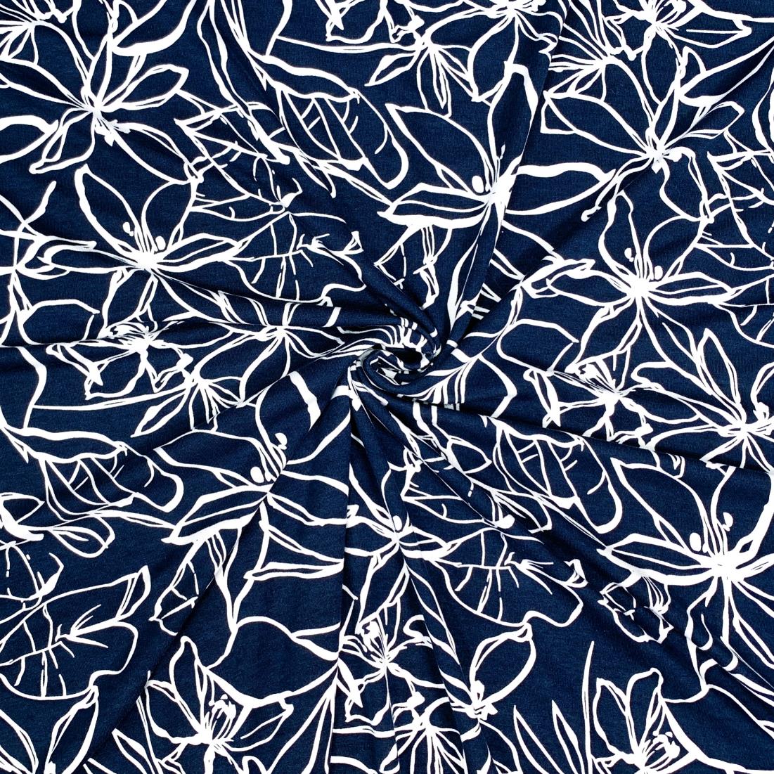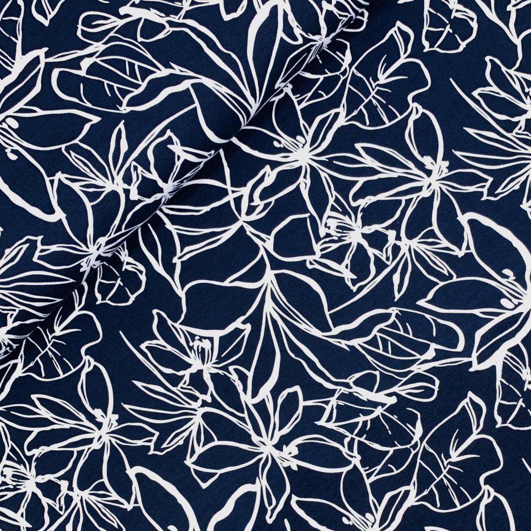 Ein wunderschöner, weicher und anschmiegsamer Viskosejersey, großflächig mit gezeichneten Blüten bedruckt. in drei zeitlos klassischen Farben. Ideal für Kleider, Shirts, Tops oder Röcke.