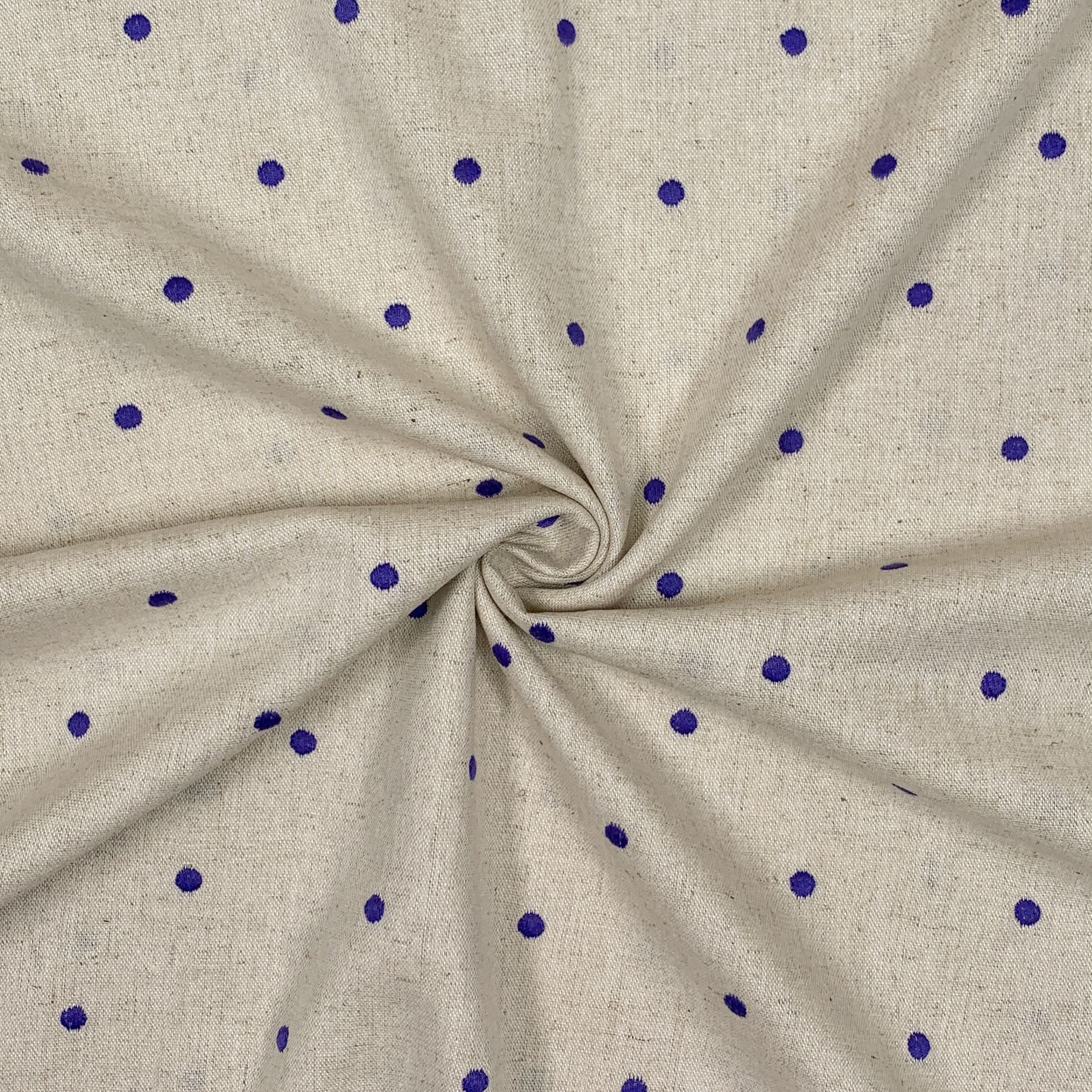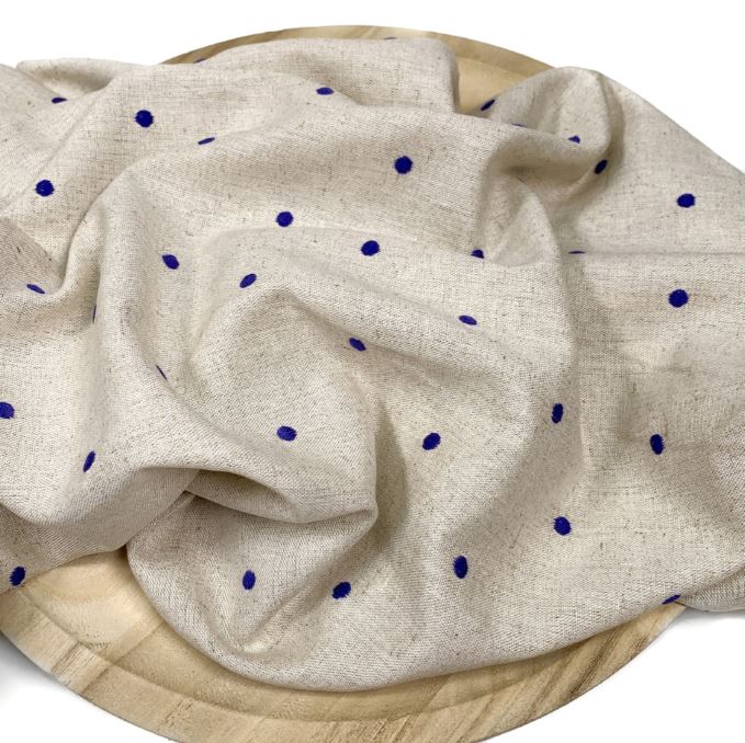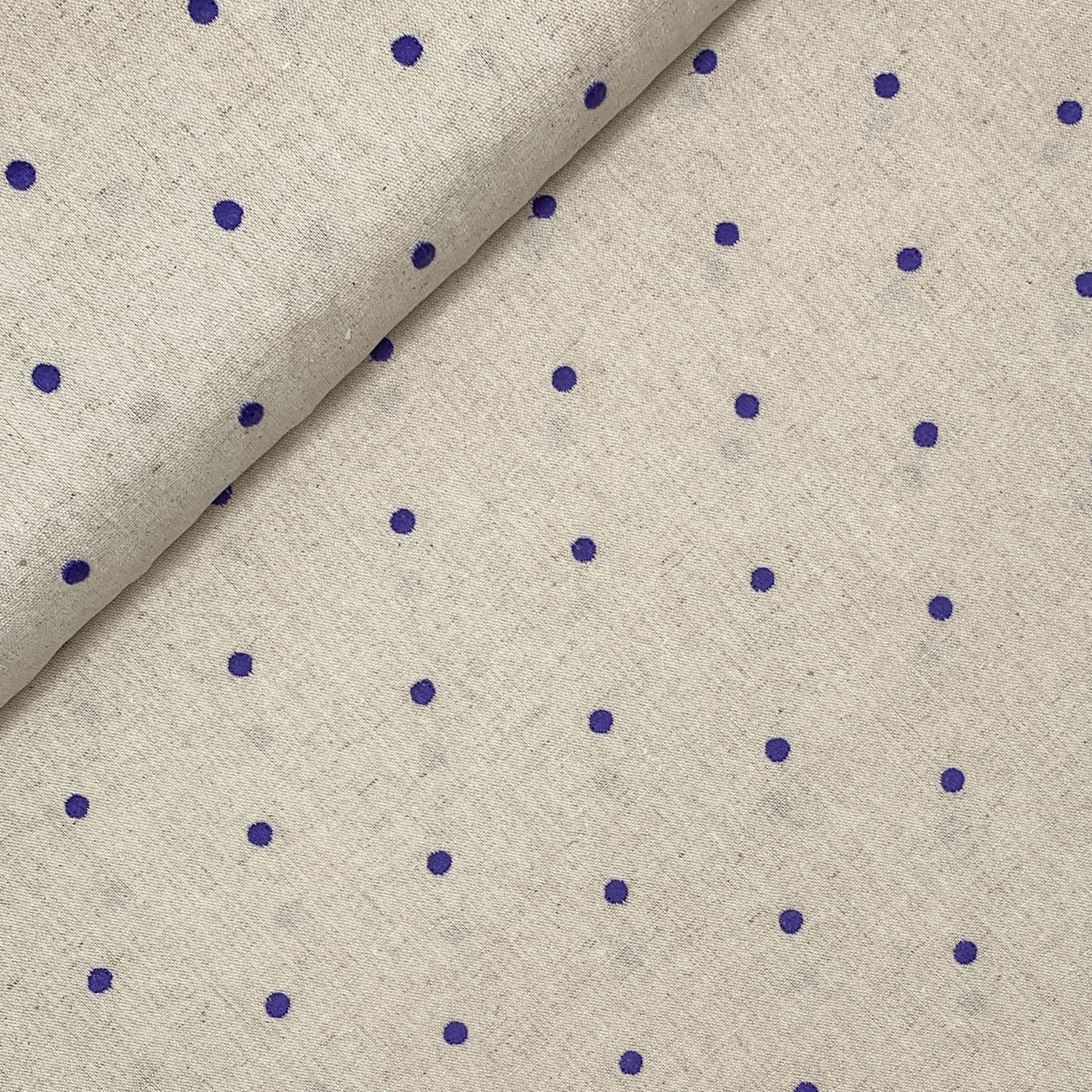 Ein weicher naturfarbenen Leinen-Viskose Stoff. Er ist wunderschön mit gleichmäßig verteilten Punkten bestickt. Ideal für Sommerhosen, Röcke, Kleider, Blusen oder Tücher.