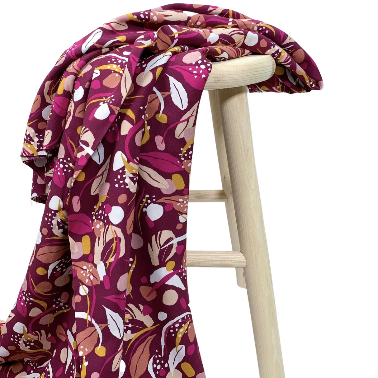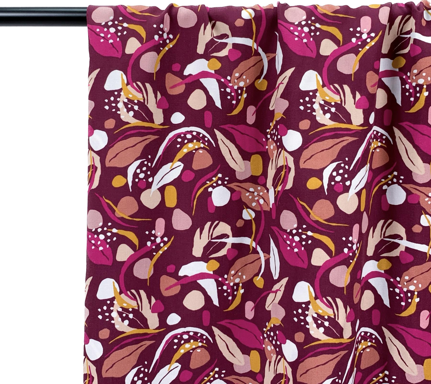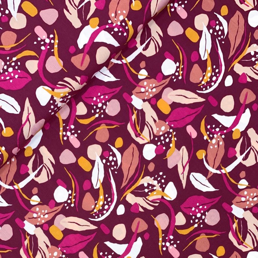 Wunderschöne Viskosewebware mit grafisch-floralem Muster. Der glatte und leichte Stoff eignet sich bestens für luftige Tops, Blusen, Kleider, Röcke oder leichte Hosen.