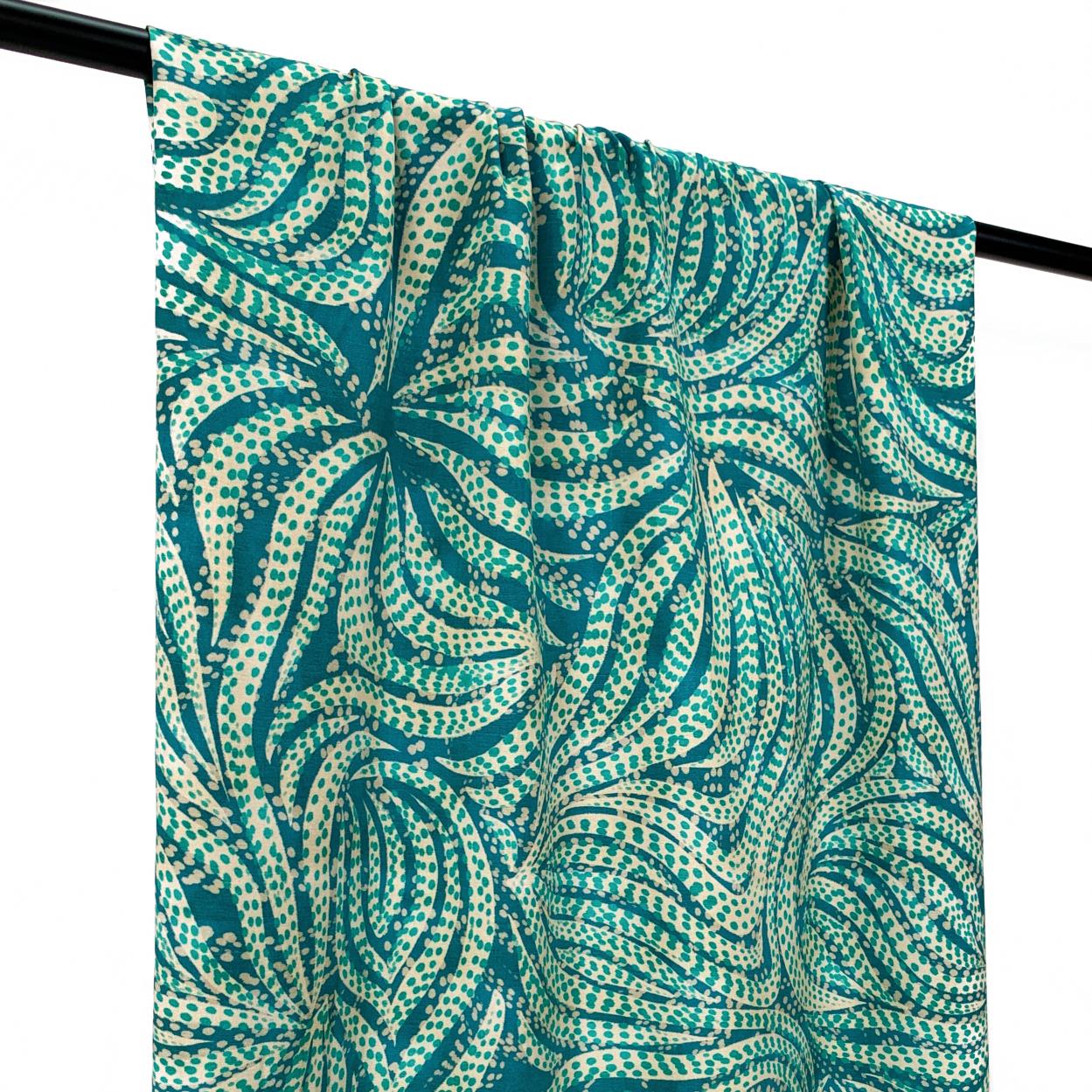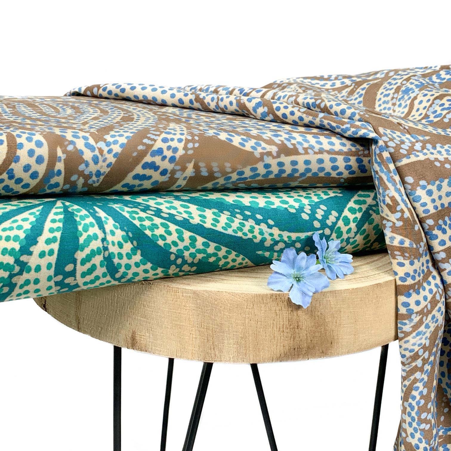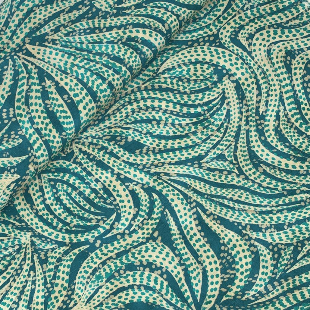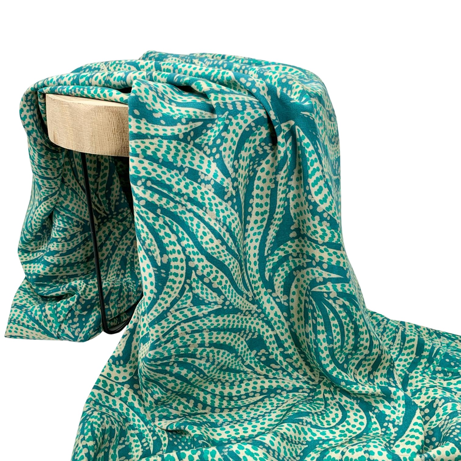 Wunderschöne, weich weich fallende Viskosewebware im modernen Ethno Style. Diese Qualität eignet sich bestens für Tops, Blusen, Kleider oder schwingende Röcke.