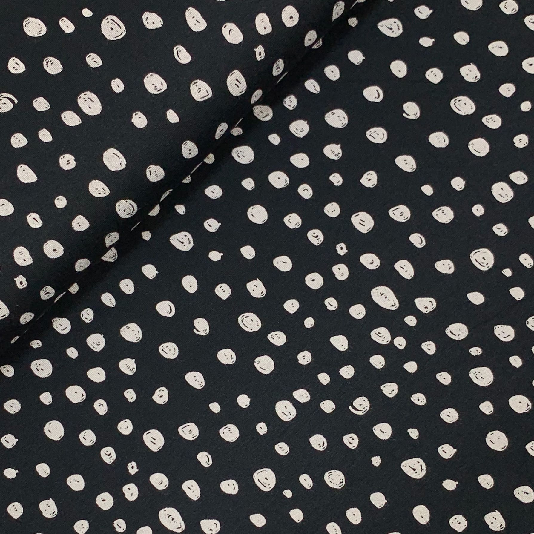 Ein schöner weicher Viskosejersey mit Tupfenmuster in zeitlosem schwarz-weiß. Ideal für T-shirts, Kleider oder auch für Röcke.