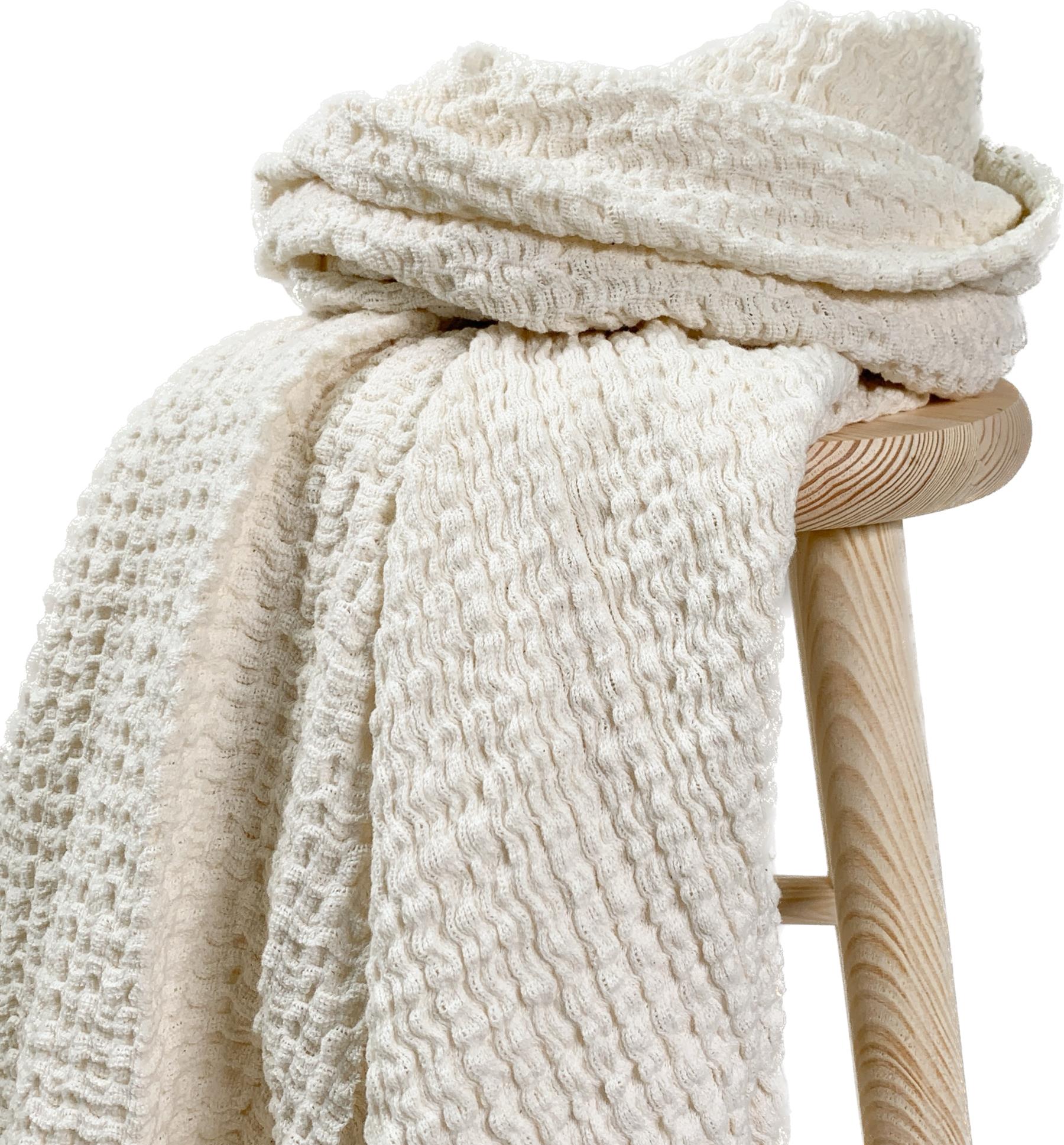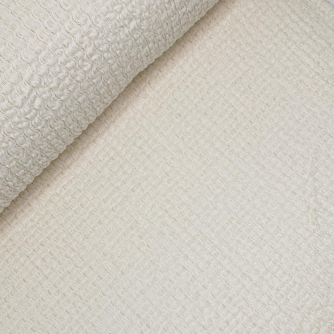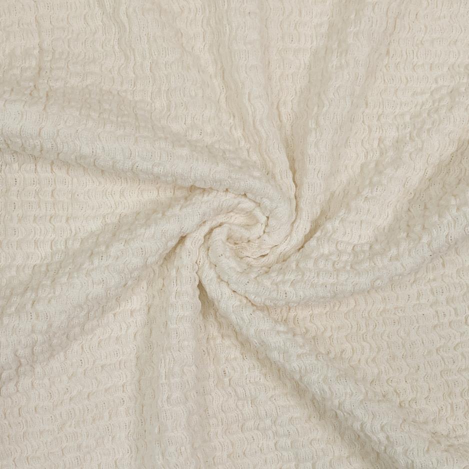 Ein herrlich weicher, strukturierter Baumwollstrickstoff in creme. Durch die lockere Strickart und die unruhige Oberfläche ist der Stoff schön stretchig und auch vielseitig einsetzbar. Ideal geeignet zum Vernähen für Shirts und Pullis, Wickeljacken, aber auch Kleider und Tücher.