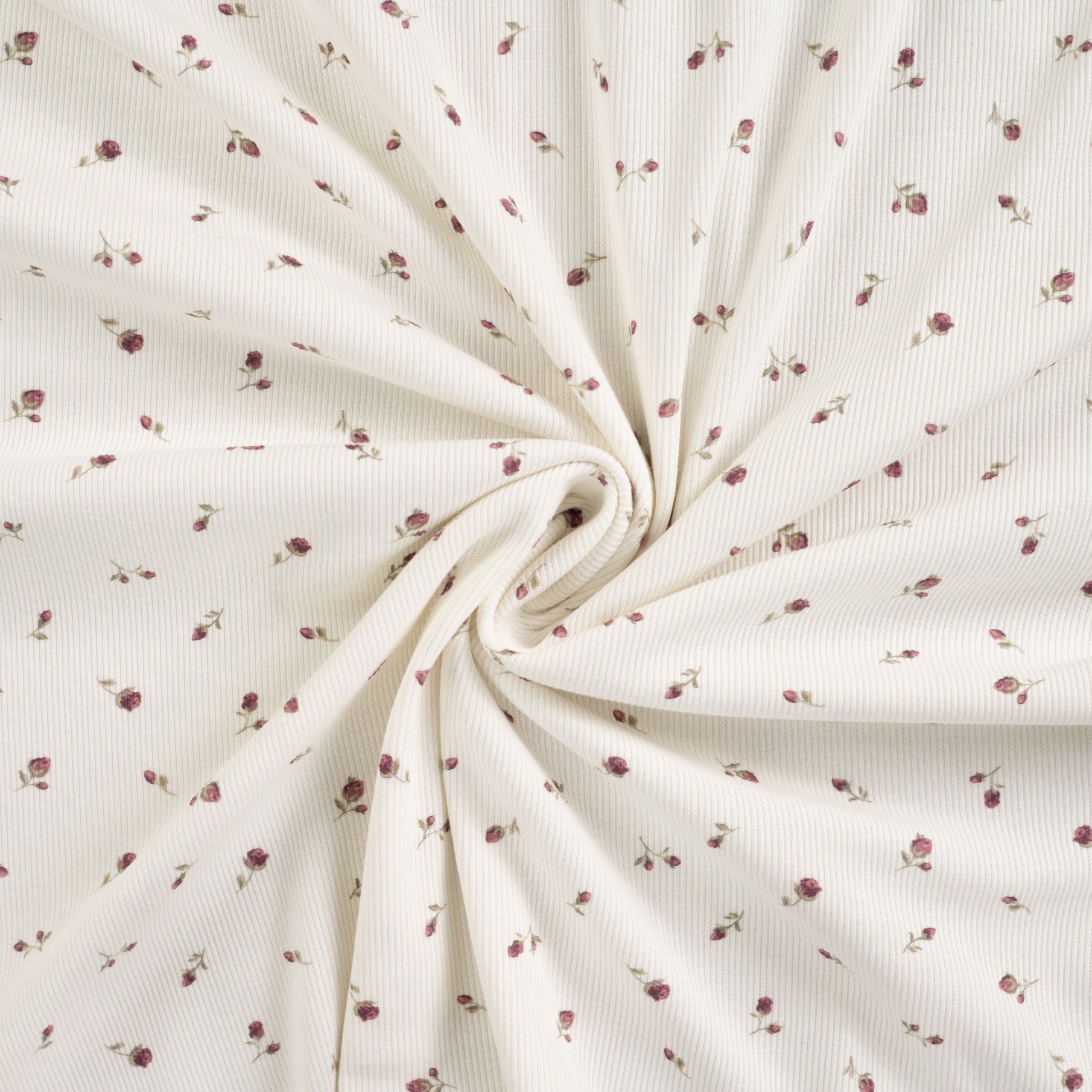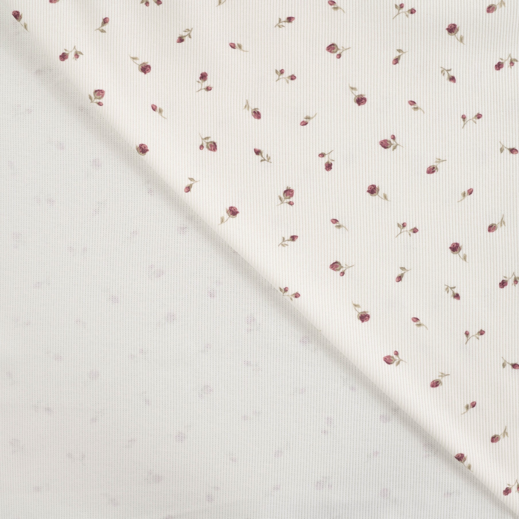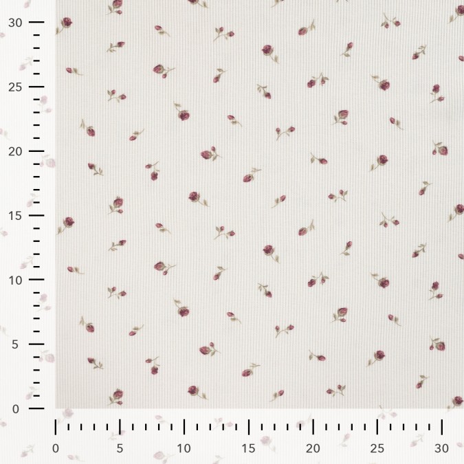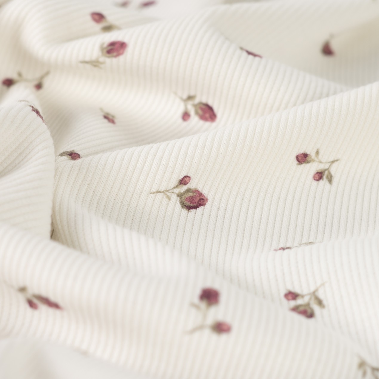 Zarter Ripjersey mit feiner Rippstruktur und romantischem Blumenmuster auf hellem Hintergrund. Der Stoff ist angenehm weich, elastisch und bietet durch seine gerippte Oberfläche einen besonders schönen Fall sowie hohen Tragekomfort. Ideal geeignet für Shirts, Bodys, Kleider, Leggings, Baby- und Kinderkleidung oder gemütliche Loungewear. Perfekt für alle, die einen femininen und gleichzeitig zeitlosen Look lieben.
