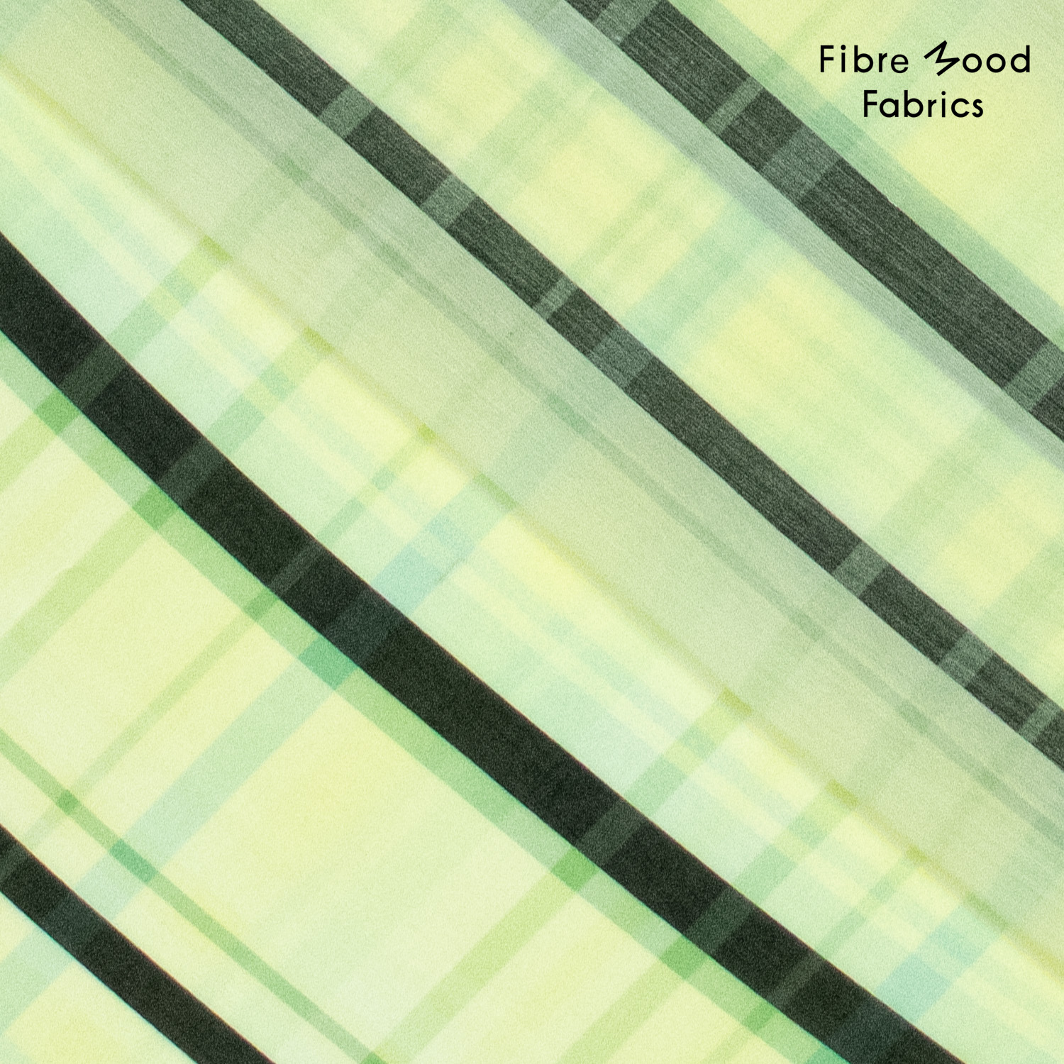 Dieser Stoff stammt aus der neuen Fibre Mood Kollektion Nr. 38. Der hochwertige Tencel™-Stoff überzeugt durch seine moderne Optik und den besonders weichen, fließenden Fall. Die feine Qualität sorgt für ein angenehmes Tragegefühl, ist atmungsaktiv und zugleich pflegeleicht. Das trendige Karomuster in frischem Hellgrün mit markanten schwarzen Streifen verleiht dem Stoff einen modernen und zugleich lässigen Look.