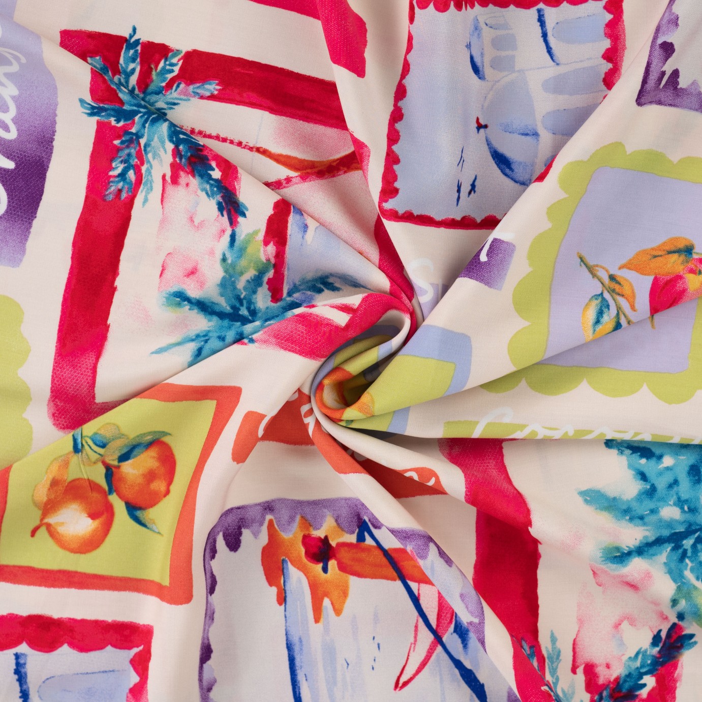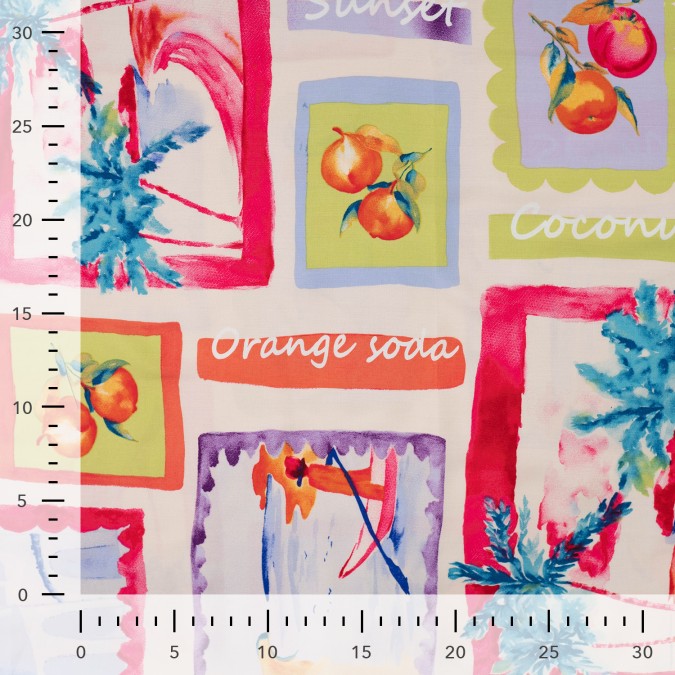 Dieser Viskose-Popeline begeistert mit seinem leichten, glatten Griff und einem angenehm fließenden Fall. Der Stoff fühlt sich weich auf der Haut an und ist durch seine luftige Qualität besonders angenehm zu tragen ideal für warme Tage. Das fröhliche, sommerliche Design erinnert an Urlaub und Sonne: dekorative Bildmotive mit Früchten, Palmen und farbenfrohen Rahmen verleihen dem Stoff einen verspielten, mediterranen Look. Die leuchtenden Farben und die künstlerische Gestaltung sorgen für einen echten Hingucker und bringen sofort Sommerstimmung in jedes Nähprojekt.