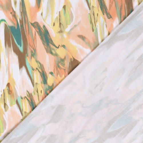 Entdecke unseren hochwertigen Viskosejersey Stoff, der mit einem einzigartigen, modernen Muster begeistert. Die harmonische Farbkombination aus sanften Pastelltönen und kräftigen Akzenten verleiht jedem Nähprojekt einen besonderen Charme. Dieser Stoff eignet sich hervorragend für die Herstellung von lässigen T-Shirts, leichten Kleidern oder bequemen Jogginghosen. Der weiche Griff und die atmungsaktive Qualität machen ihn perfekt für den Alltag.