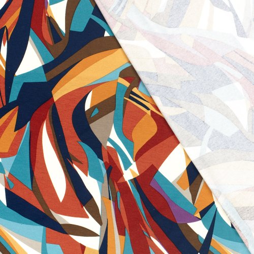 Wunderschöner, weicher Viskosejersey bedruckt mit vielfarbigem abstrakten Muster. Ideal für Kleider, Shirts, Tops oder Röcke.