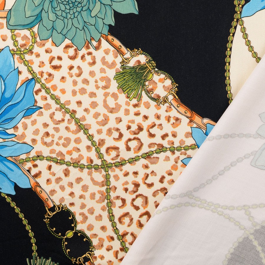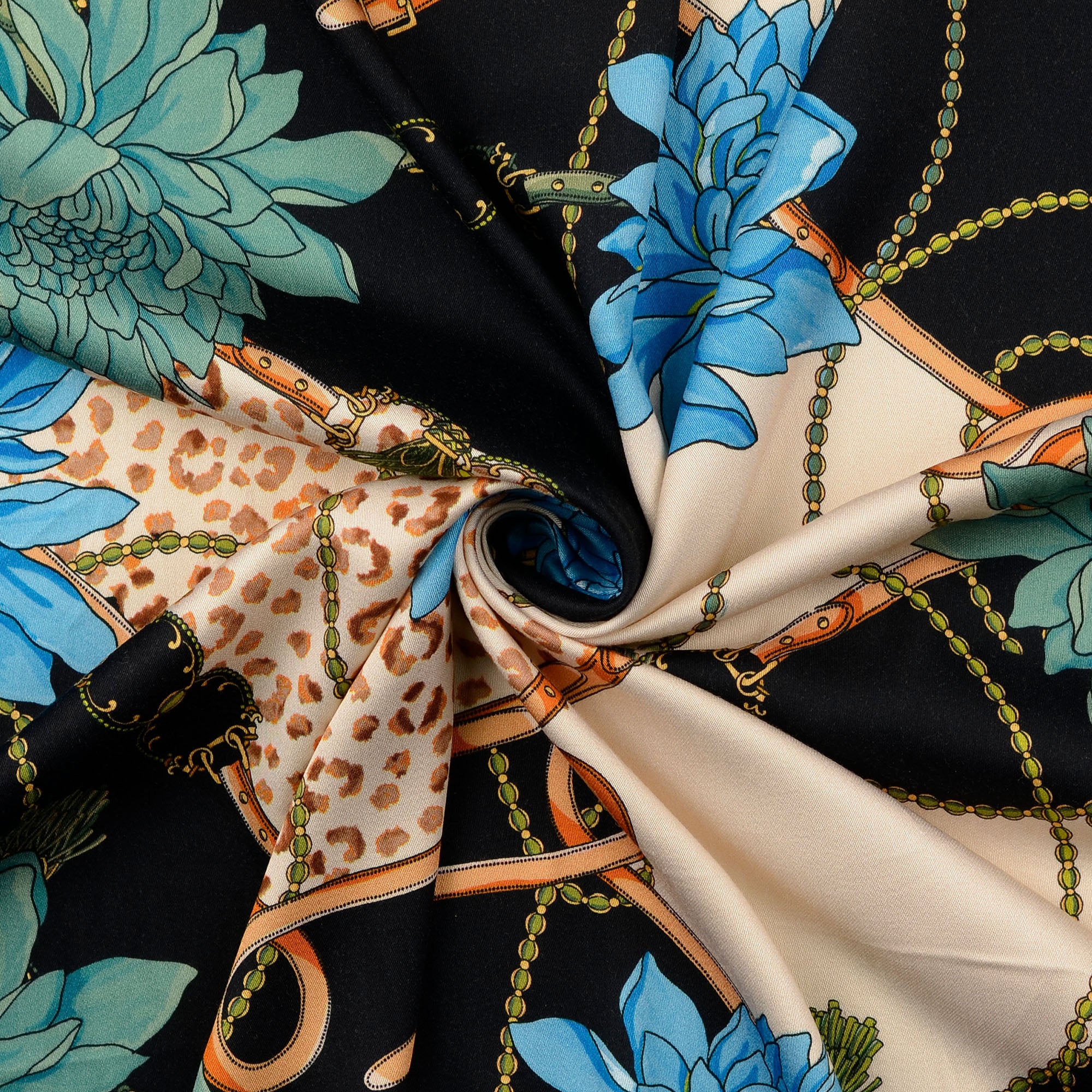 Dieser matte Viskosesatin überzeugt durch seinen weich fließenden Fall und eine angenehm glatte Oberfläche. Das ausdrucksstarke Design mit großen Blüten, dekorativen Kettenelementen und Leo-Details verleiht dem Stoff eine moderne und stilvolle Optik.